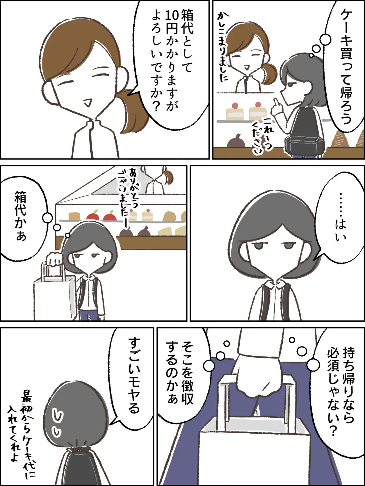 お持ち帰りじゃないですか。それ断ったらケーキそのまま差し出されるってこと?私が知らないだけでみんな「エコ箱」とか持ち歩いてるの?
