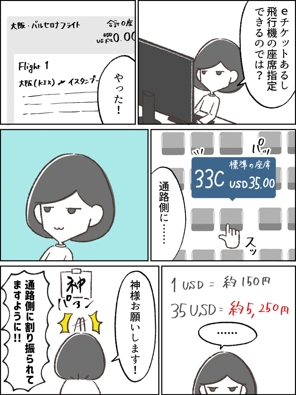 もう10年以上も海外旅行行ってないからよくわからないが、今は座席指定は有料のところがほとんどなのだろうか。昔オーストラリアに行ったときは追加代金払った記憶がない。てかこの値段も標準なのか?エコノミーだから?しかも私は関空-イスタンブール-バルセロナと乗り継ぎがあるため、区間ごとにお金がかかってくる。嘘やろ、まさかここにきてさらなる料金がかかってくるとは思ってなかった。