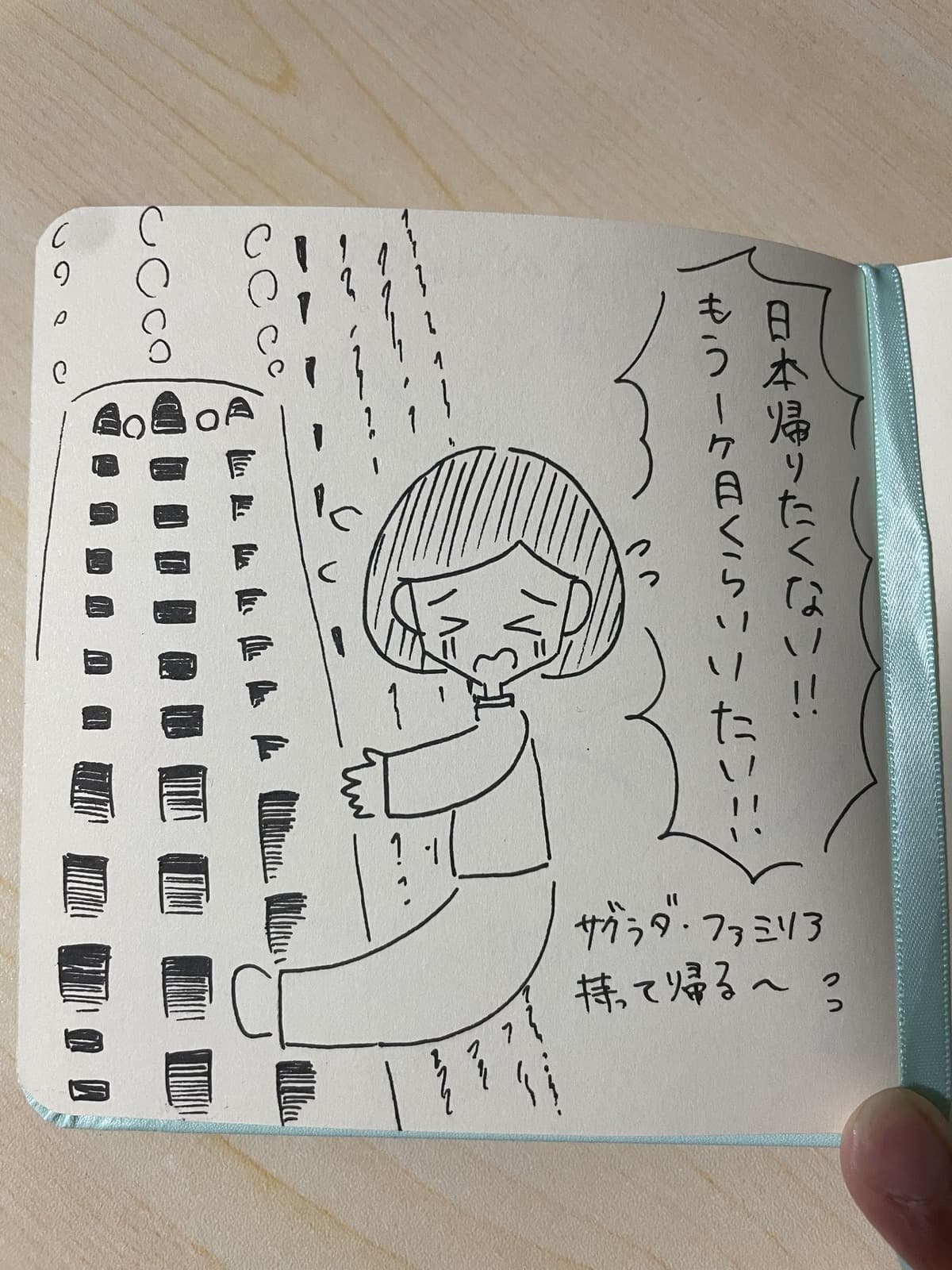 バルセロナにいました 絵日記 2025.10.23 何事もなければ今頃もう日本に到着しているでしょう。サグラダ・ファミリアと一つになってバルセロナに居続けたい気持ちをなんとか押しとどめて、日本の地に降り立っているでしょう。 滞在中嫌な思いなど一つもすることなく、毎日が本当に楽しかった。 死ぬ前に必ずもう一度行くよ、今度はサグラダ・ファミリアが完成した後で。 カサ・ミラの屋上から。光が本当に美しい。 カサ・ミラの屋上から見たサグラダ・ファミリア バルセロナでの最後の晩餐。ミートボール ↓ランキング参加しています。 にほんブログ村 にほんブログ村 拍手 0