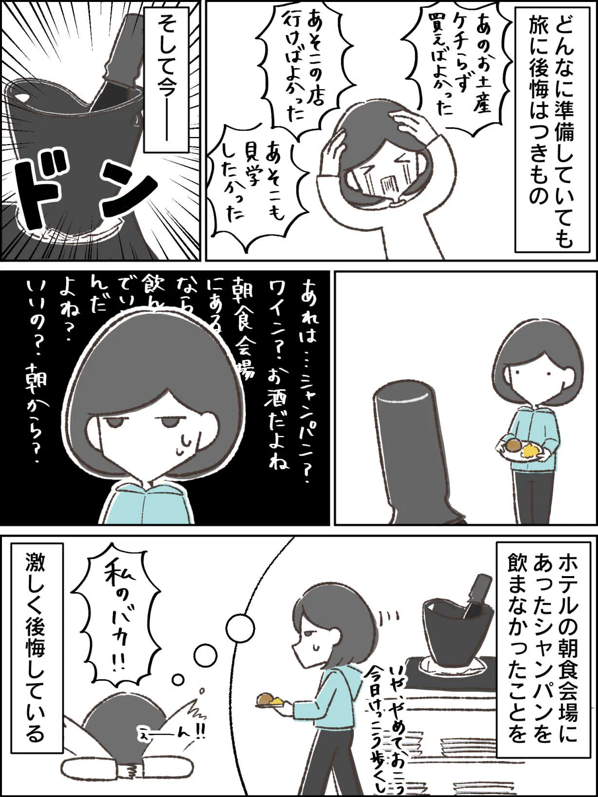 目下私が胸を搔きむしらんばかりに後悔しているのが、朝食会場にあったシャンパンだかワインだかを飲まなかったこと。誰も手を付けてなかったし、飲んでいいか聞くのも恥ずかしくてスルーしてしまったのだ。なんで!?ハムもチーズもあったんだから、めちゃくちゃ優雅なモーニングできたはずじゃん。そもそも朝食ビュッフェに酒があること自体珍しいじゃないか……