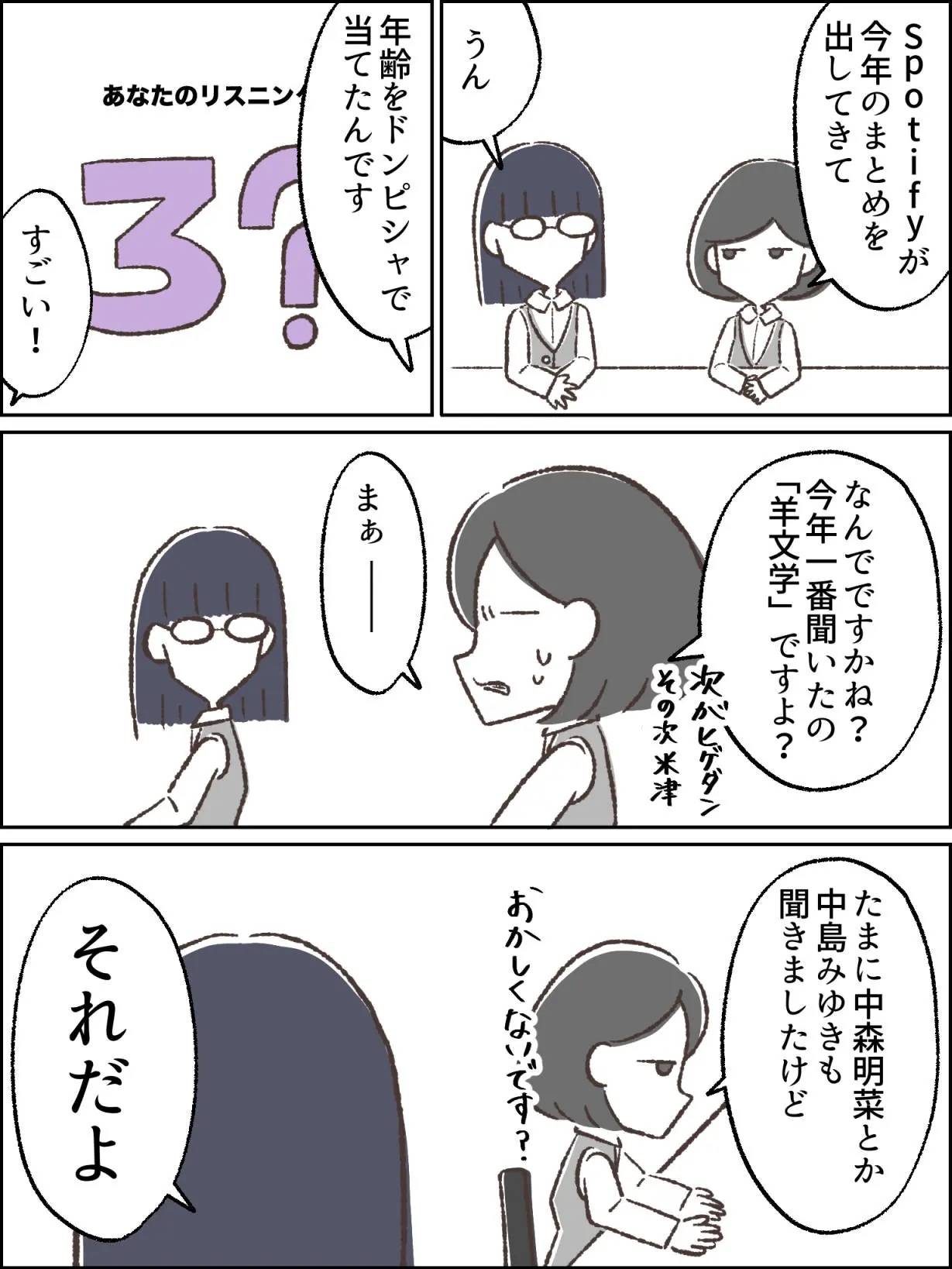 検索履歴や視聴内容、他のユーザーとの比較から年齢を推察しているのだろう。でも待ってほしい。そんなに懐メロばかり聞いていたわけではない。今年1番聞いていたグループは「羊文学」だったし(これは意外だった)、次点がOfficial髭男dismだった。その後に米津玄師、HANA、KING GNU、ヨルシカと続く。オタクっぽいのは認める。