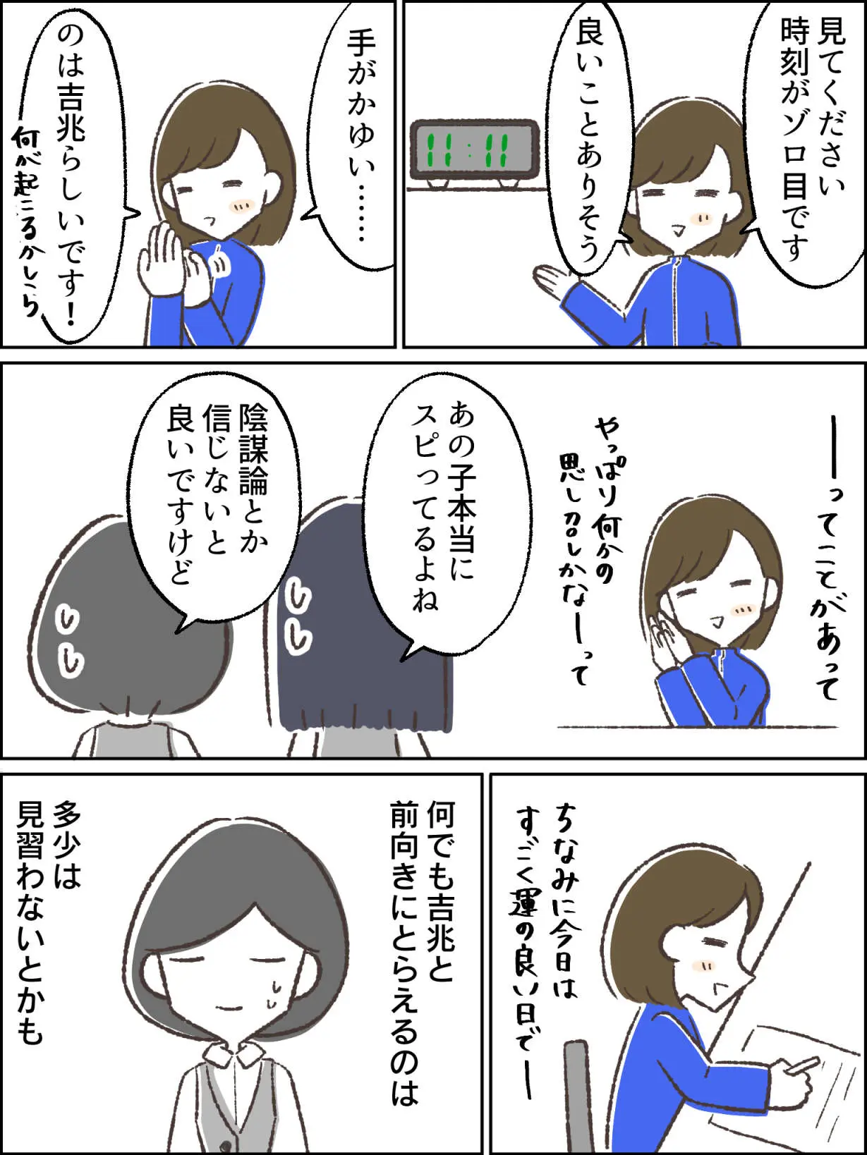 ただ職場のスピ子さん、時計が11時11分を指してたら「良いことありそう」、ちょっとしたイレギュラーが起こるたびに「何か新しいことが始まりそう」と、楽しそうでもある。