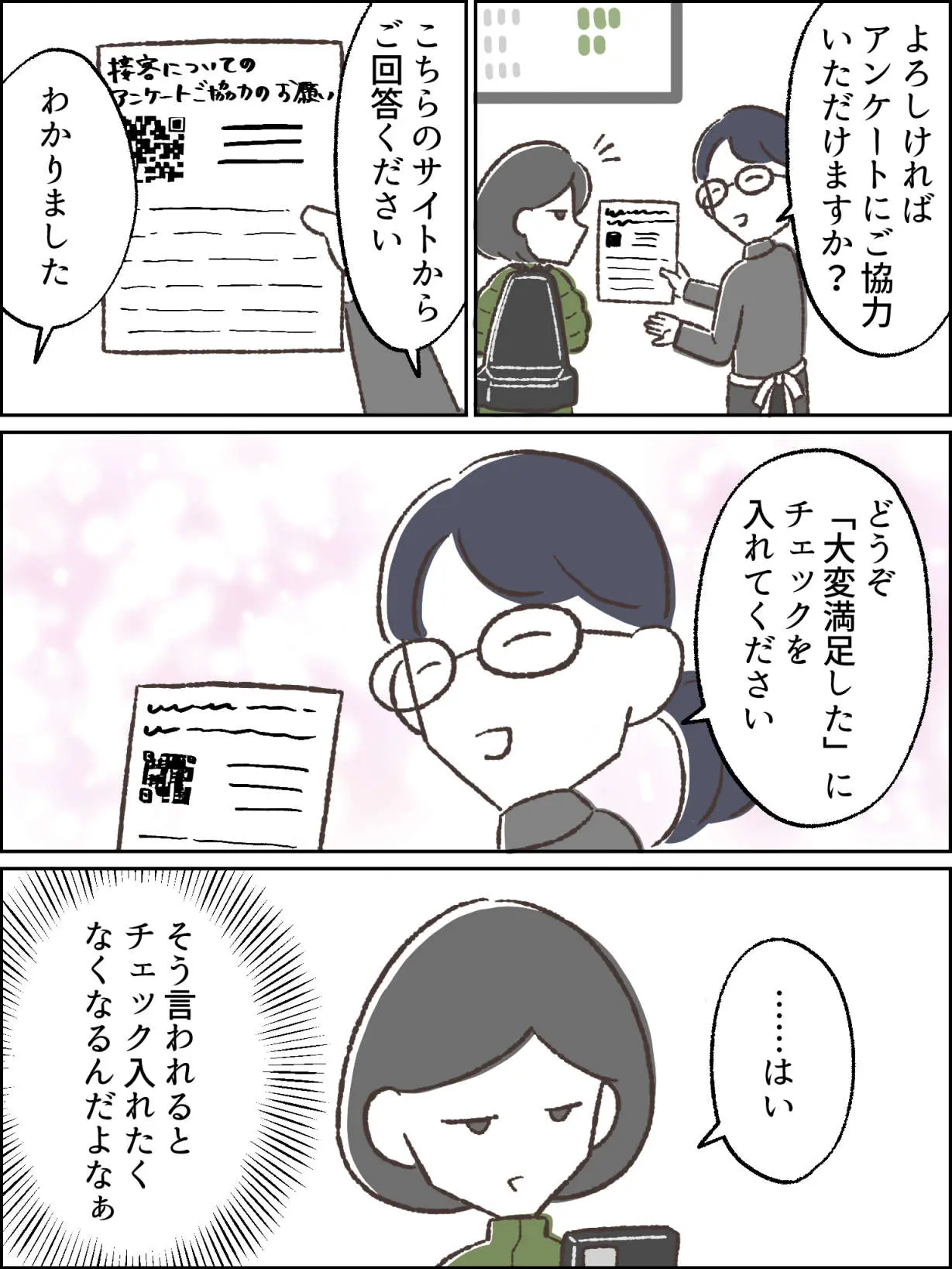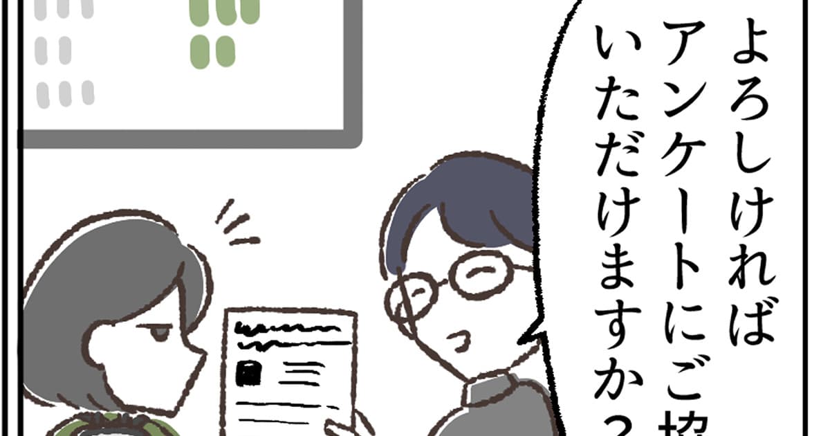 アンケートへの協力をお願いされたらなるべく受けるようにしている。勤務先でもアンケートを取っていて、答えてもらえないのは地味に傷つくとわかっているからだ。あとやっぱりサービスを良くしたい、問題点を改善したい気持ちがあるから取っているものなので、お互い頑張りましょうの意味合いも込めて協力している。