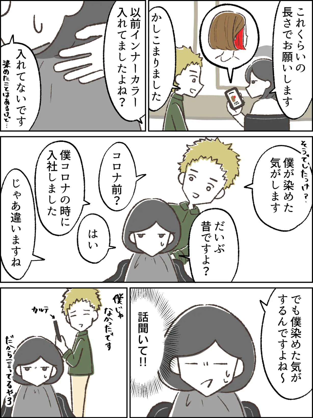 しかも前に私の髪を染めたことがあると言ってくる。たしかにその美容院で染めたことあるけど、もうずいぶん昔の話である。よく話を聞くとその頃はまだ入社もしていないらしい。