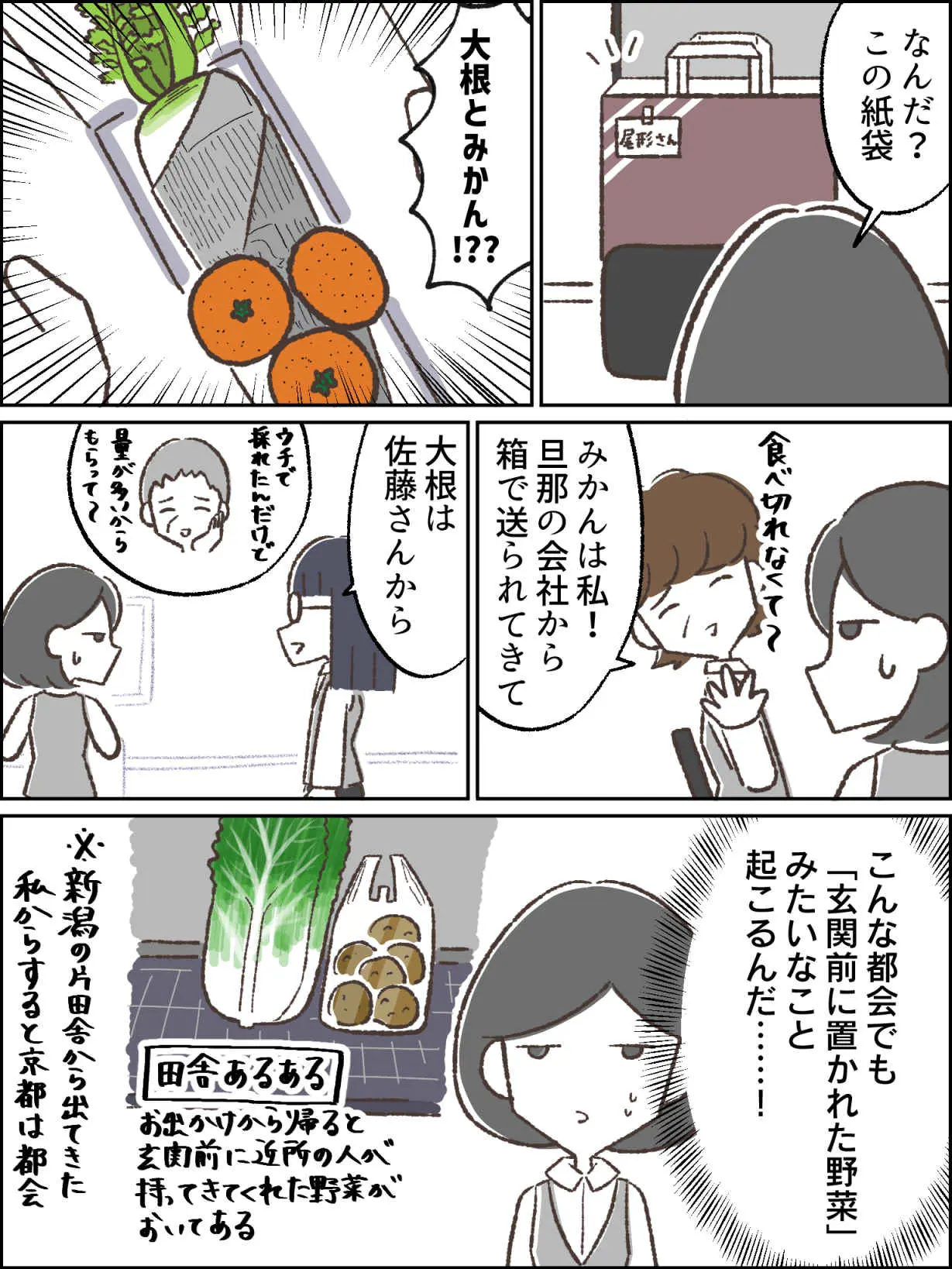 北か南か海か山か。場所によっても違うだろうけど、「帰宅すると玄関前に置いてある近所の人が持ってきてくれたであろう野菜」は幅広い地域であるあるだと思う。
