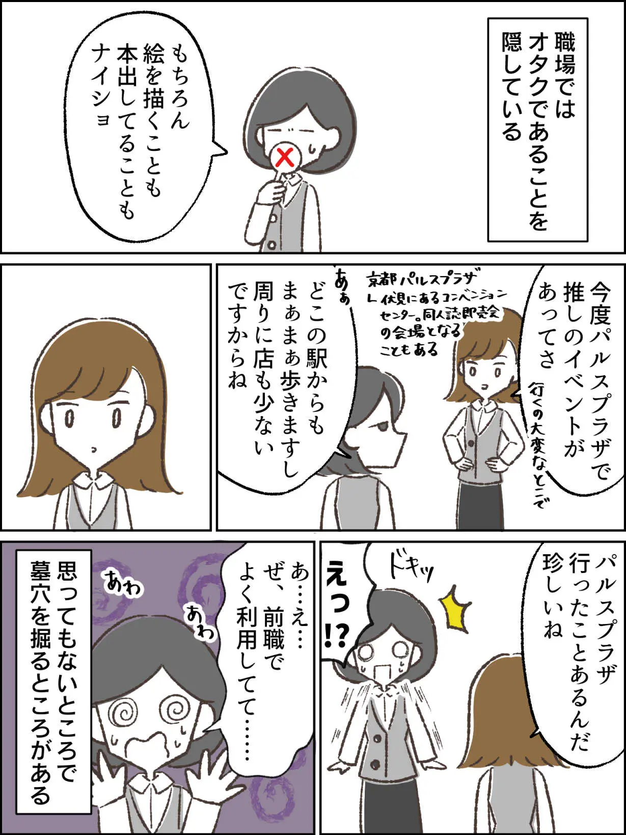 職場はとにかく古い会社でオタクは嘲笑の的である。そのためアニメ見てることも漫画読んでることもひた隠しにしている。自分でも絵や漫画を描いて、あまつさえそれを売っているなんて口が裂けても言えない。職場においては墓場まで持っていくレベルの秘密である。