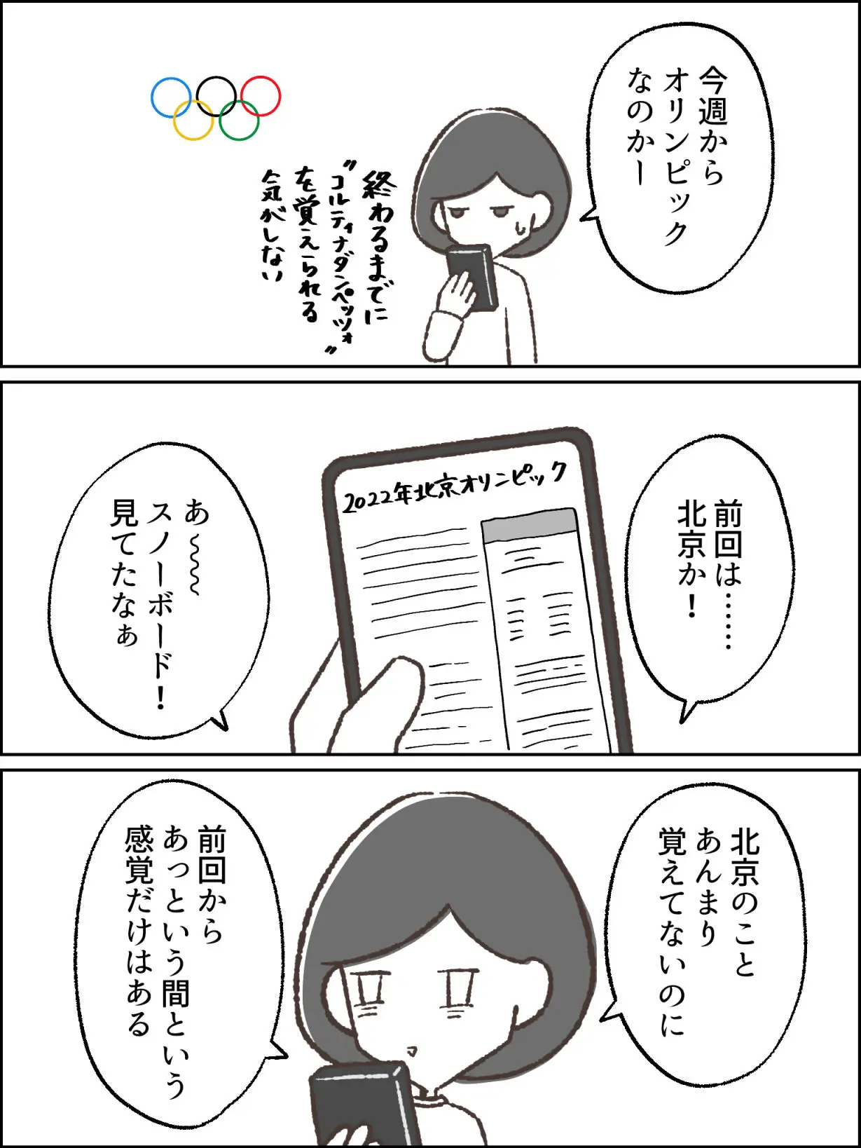 前回の冬季オリンピックはどこだったかと調べたら、北京だった。夏のイメージの方が強いが、そういえば冬もやってたな。パンダのマスコットが可愛かったのは薄ぼんやりと覚えている。調べてたらスノーボードで平野選手が金メダルを獲得した大会だった。あれ見てたなぁ。ものすごい高さでくるくる回っている姿を思い出した。フィギュアがゴタゴタしたのもこの大会だった。