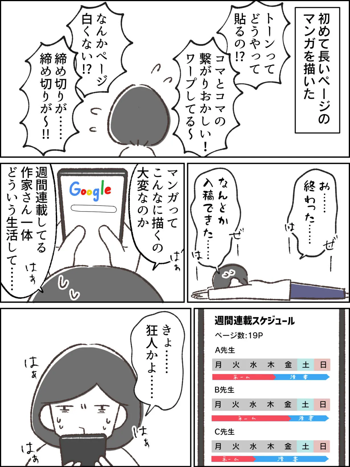 たった1日だけのイベントに向けて描くのも相当しんどかったのに、これを専業で描いている人は頭おかしくならないんだろうか。週間連載してる作家さんのスケジュール調べてみたらほぼほぼ1週間休みなく執筆してた。イかれてるだろ。